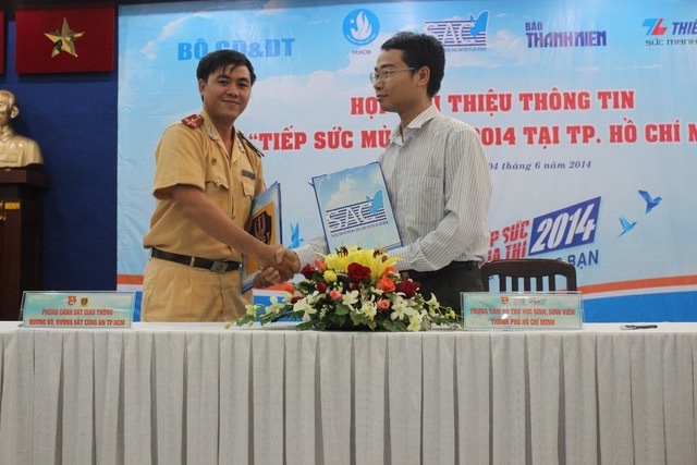 Thiếu tá Đinh Minh Vương và ông Lê Xuân Dũng (hiện là Giám đốc Trung tâm hỗ trợ Học sinh, sinh viên TP.HCM) trong buổi lễ ký kết liên tịch năm 2014