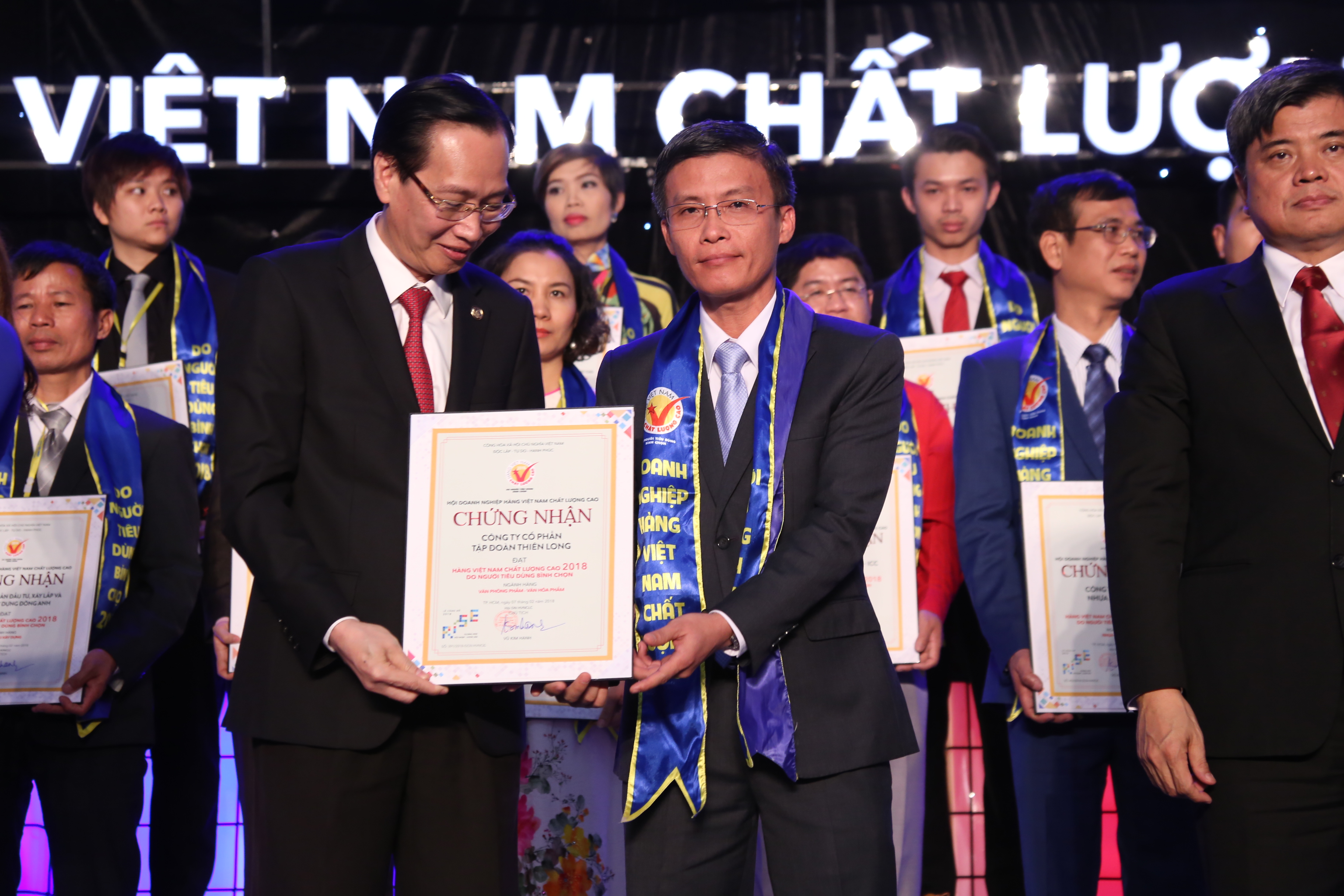 Ông Nguyễn Thượng Việt - Phó Tổng Giám đốc Kinh doanh nội địa (phải) đại diện Tập đoàn Thiên Long nhận giải thưởng Hàng Việt Nam chất lượng cao năm 2018.