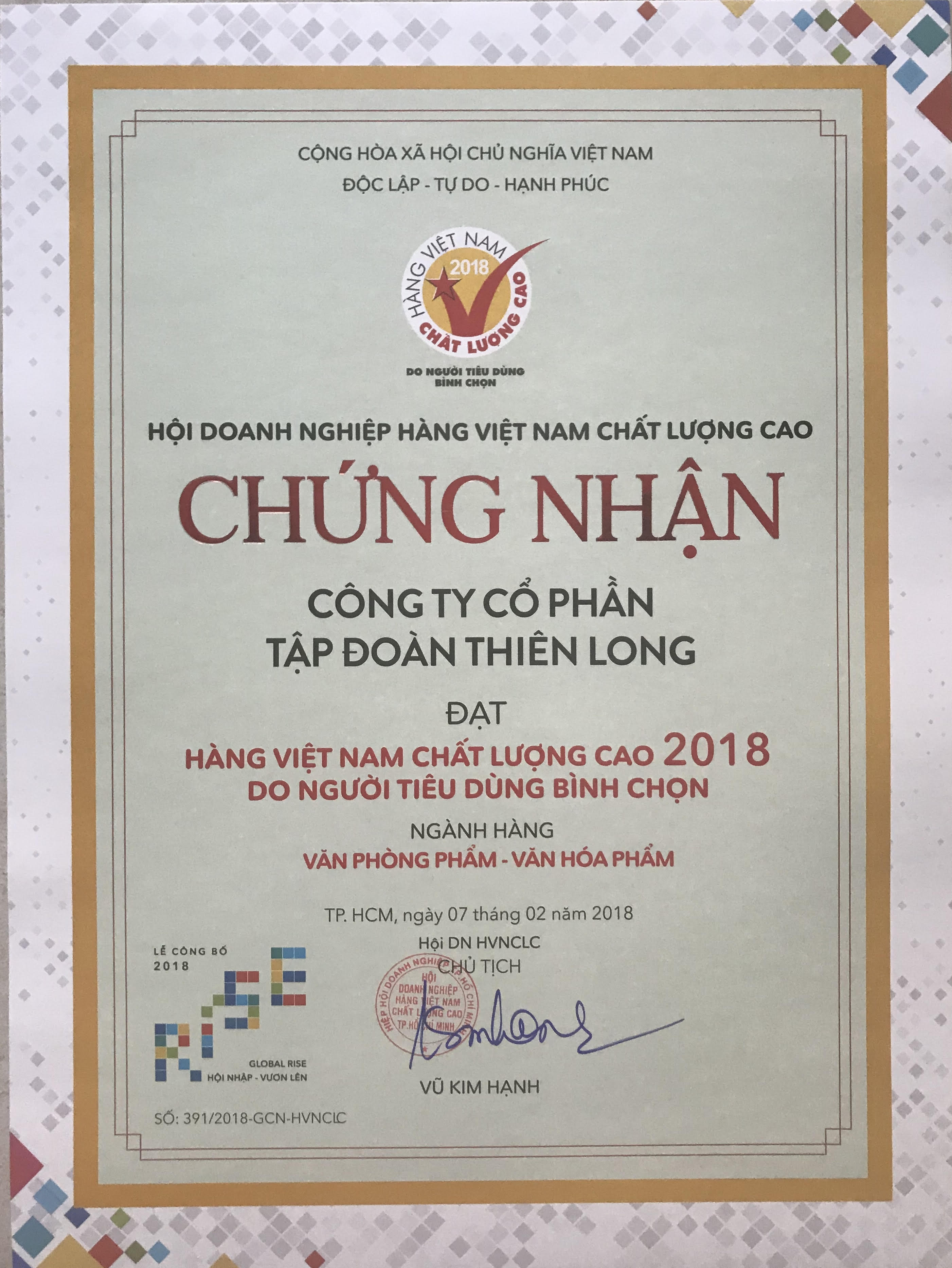 Năm 2018, Thiên Long tiếp tục được người tiêu dùng bình chọn là Hàng Việt Nam chất lượng cao. Thông tin được công bố trong Lễ trao danh hiệu Hàng Việt Nam chất lượng cao năm 2018 do Hội Doanh nghiệp Hàng Việt Nam chất lượng cao tổ chức vào ngày 07/2 tại TP.HCM.