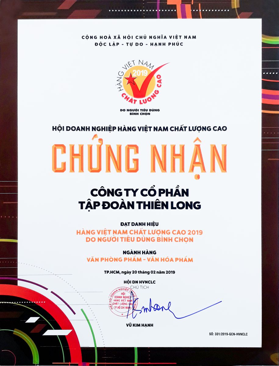 Chứng nhận danh hiệu Hàng Việt Nam Chất Lượng Cao năm 2019 của Thiên Long