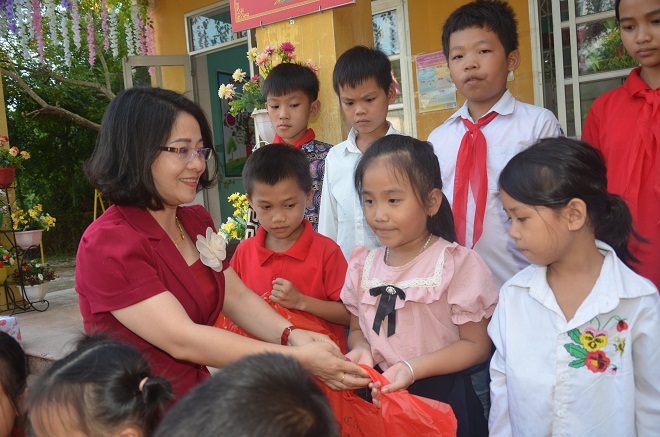 Bà Ninh Hương Giang đã trực tiếp nhận và trao tận tay các học sinh Trường Tiểu học xã Đồng Thắng những món quà ý nghĩa này.