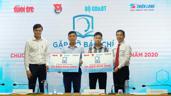 Anh Bùi Quang Huy, bí thư Trung ương Đoàn (trái) và ông Trịnh Văn Hào (phải) trao hỗ trợ kinh phí cho hai công trình, sáng kiến đoạt giải năm 2019 tại lễ phát động chương trình “Tri thức trẻ vì giáo dục” năm 2020 ngày 5-6 - Ảnh: NAM TRẦN