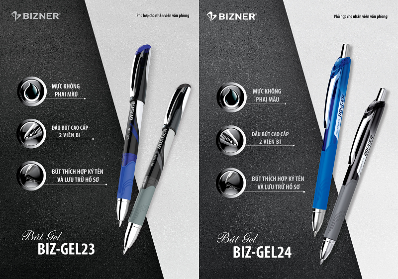 Đặc biệt, BIZNER còn giới thiệu thêm hai dòng sản phẩm mới ra mắt năm nay là BIZ-Gel23, BIZ-Gel24. Đây là hai loại bút ký cao cấp được sản xuất theo công nghệ mới, với đầu bút cao cấp 2 viên bi giúp cho nét viết êm, trơn, mực ra đều và liên tục. Hai loại bút này rất thích hợp ký tên và lưu trữ hồ sơ vì rất bền mực, không phai màu.