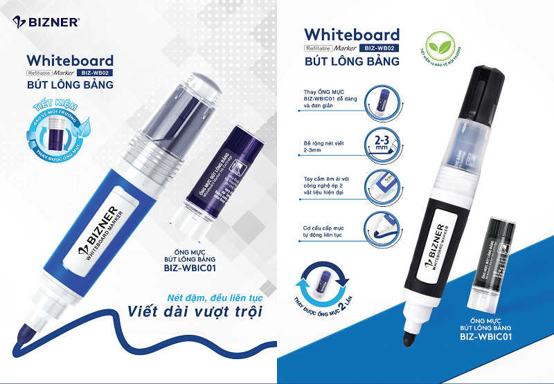BIZ-WB02 là loại bút thuộc nhóm bút lông bảng cao cấp. Được ra mắt vào năm 2019, hai sản phẩm này gây ấn tượng vì hướng đến mục tiêu xanh - thân thiện môi trường. Bởi lẽ, loại bút này sử dụng ống mực BIZ-WBICO1, người dùng có thể dễ dàng thay ống mực, gia tăng vòng đời của sản phẩm, từ đó, giảm được lượng rác thải nhựa thải ra môi trường. BIZ-WB02 được ứng dụng công nghệ cấp mực tiến tiến mà hiện nay chỉ có một số ít công ty trên thế giới ứng dụng vào sản xuất trong đó của Thiên Long.