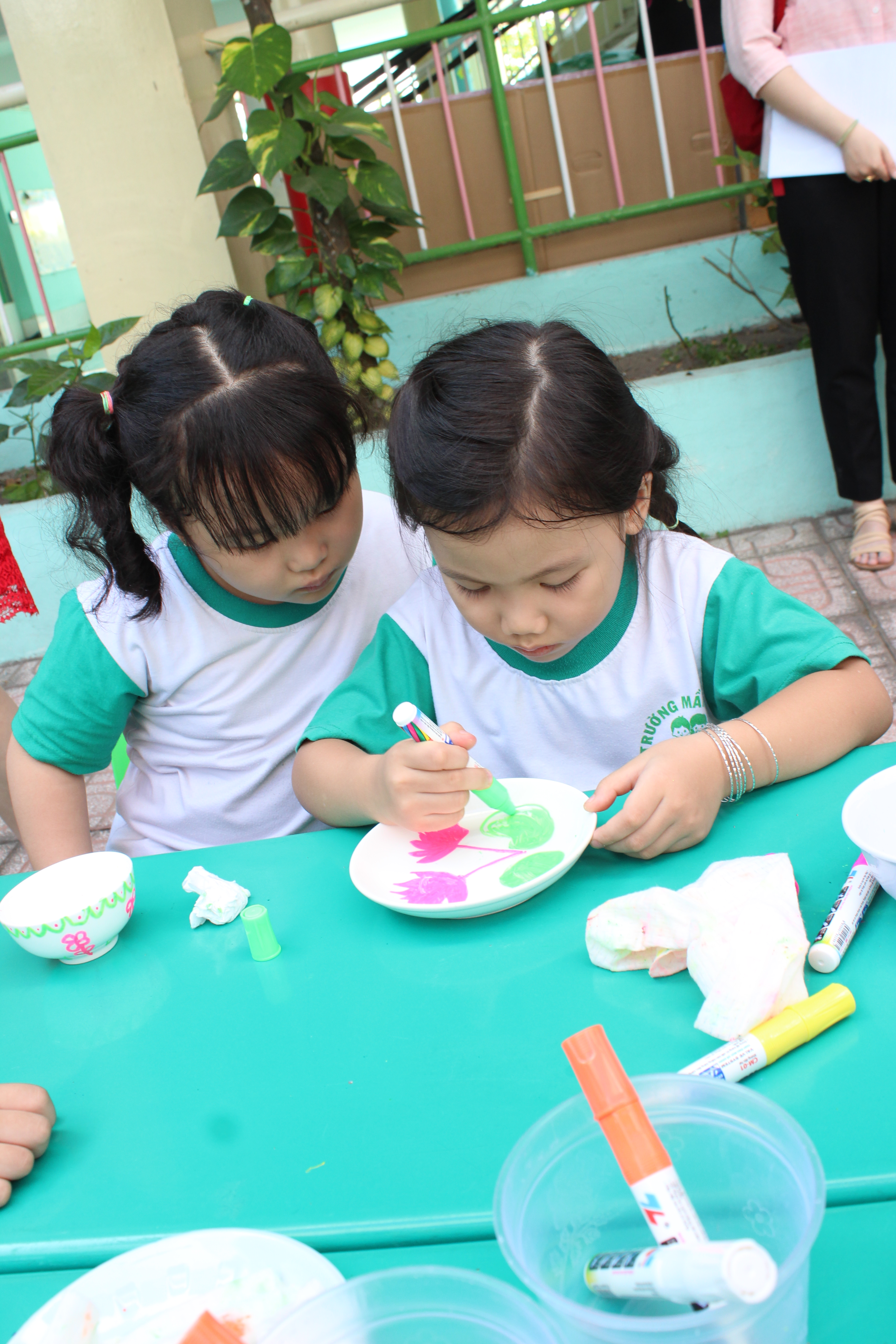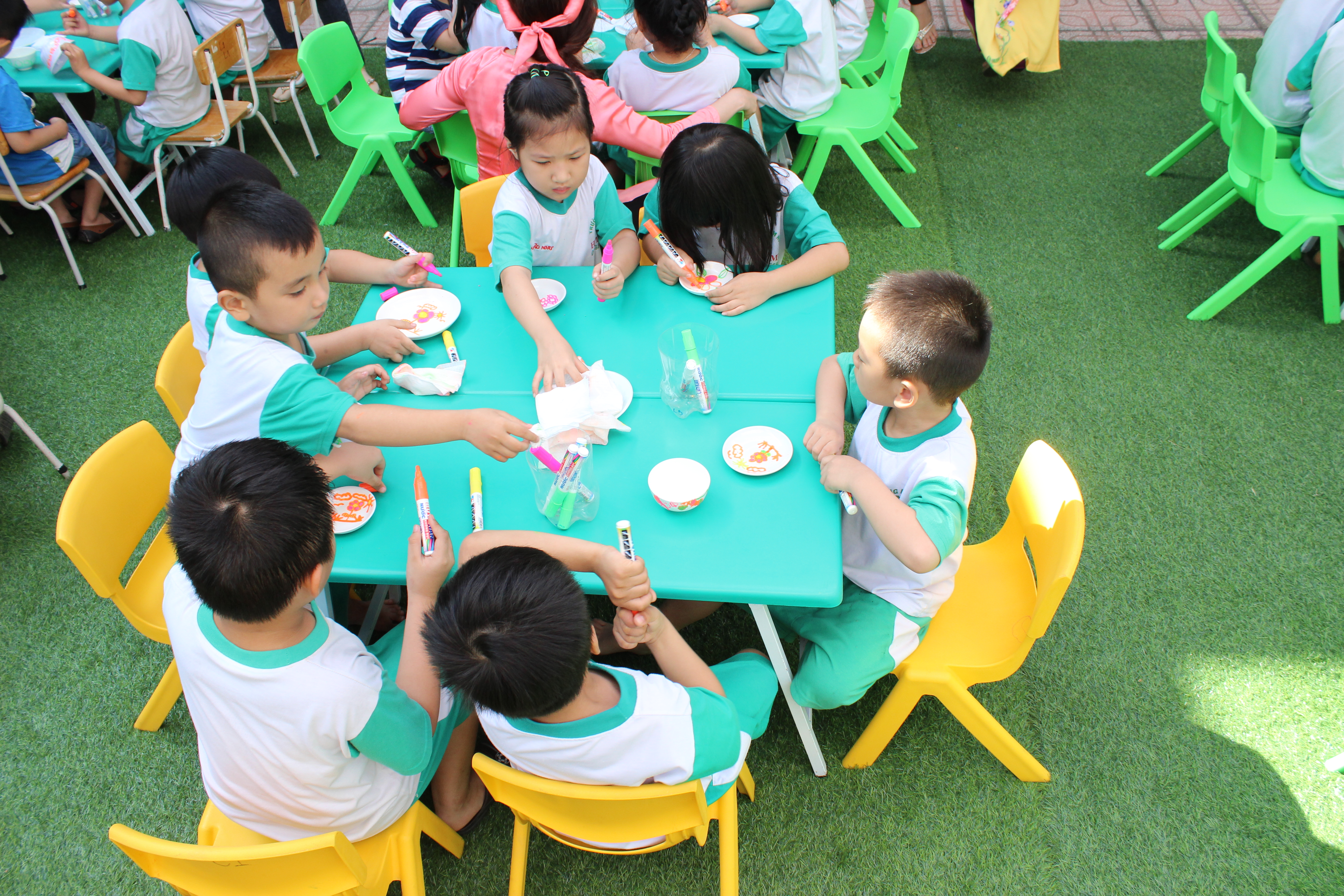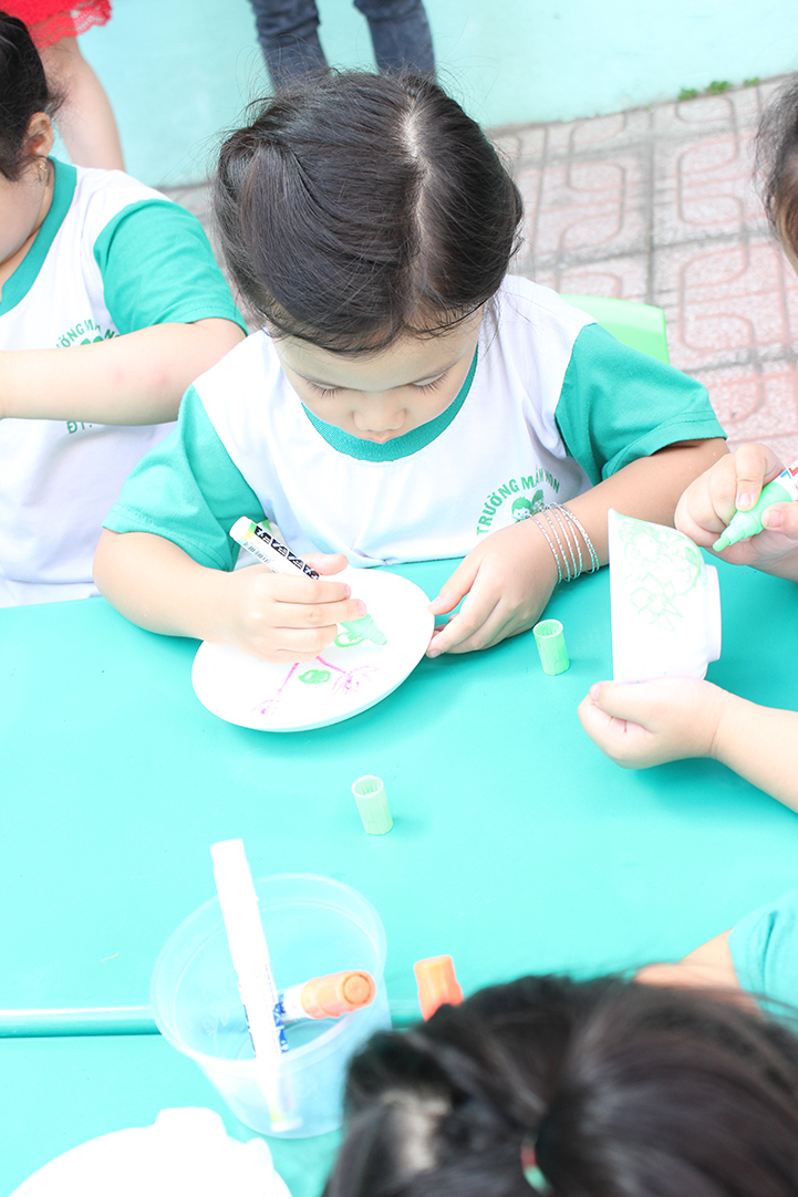Các em lớp lá vẽ tranh lên dĩa với bút phấn nước Colokit.