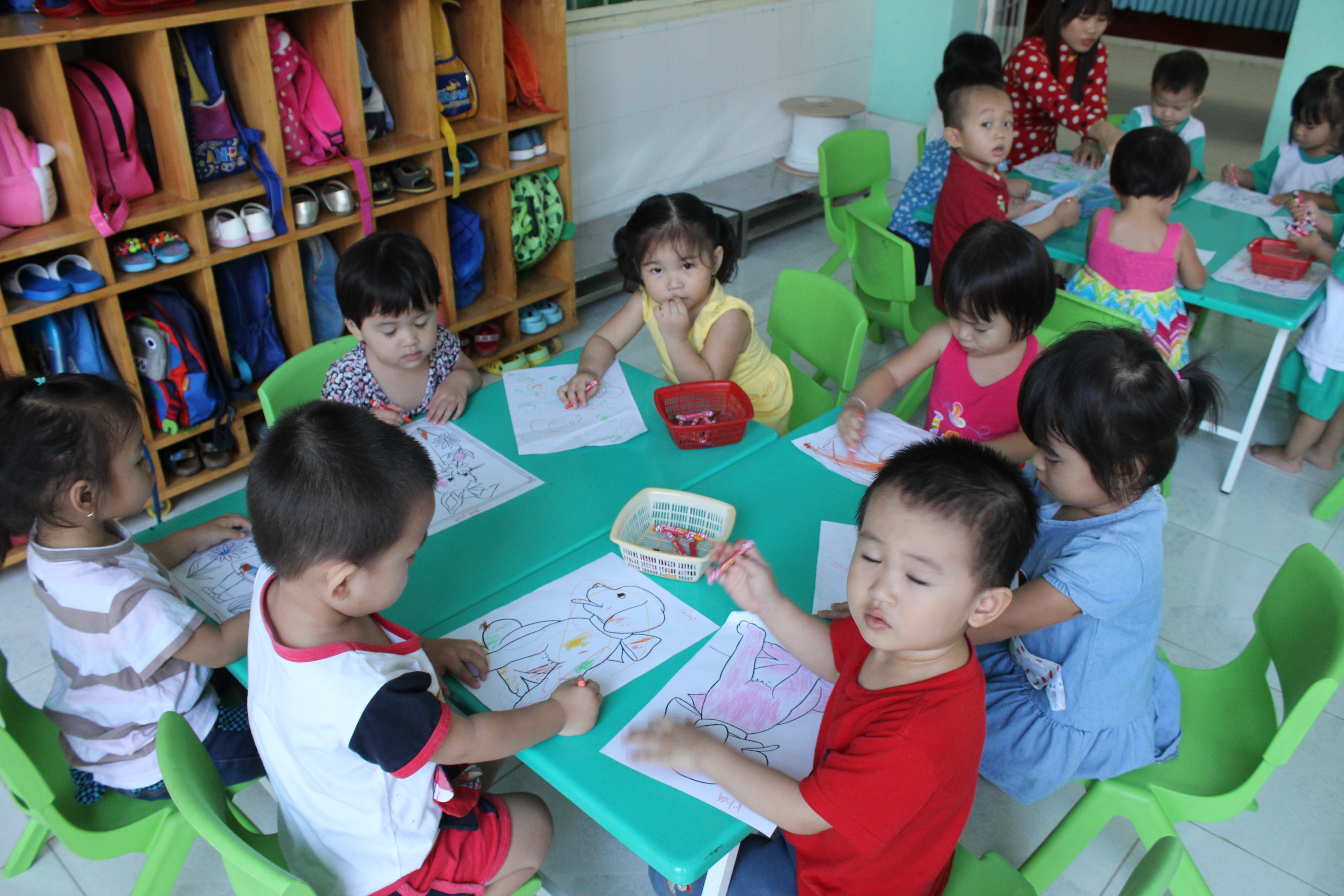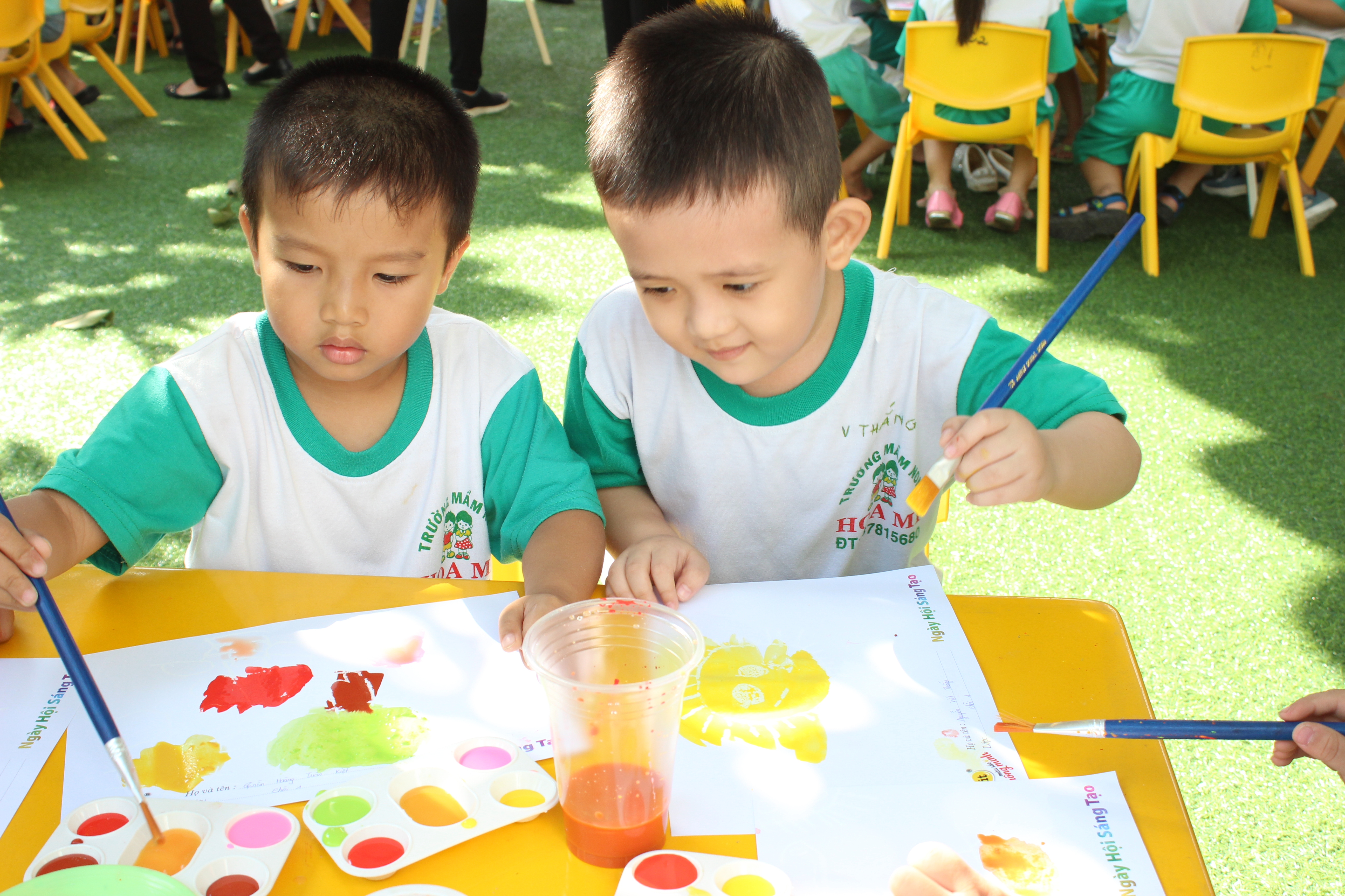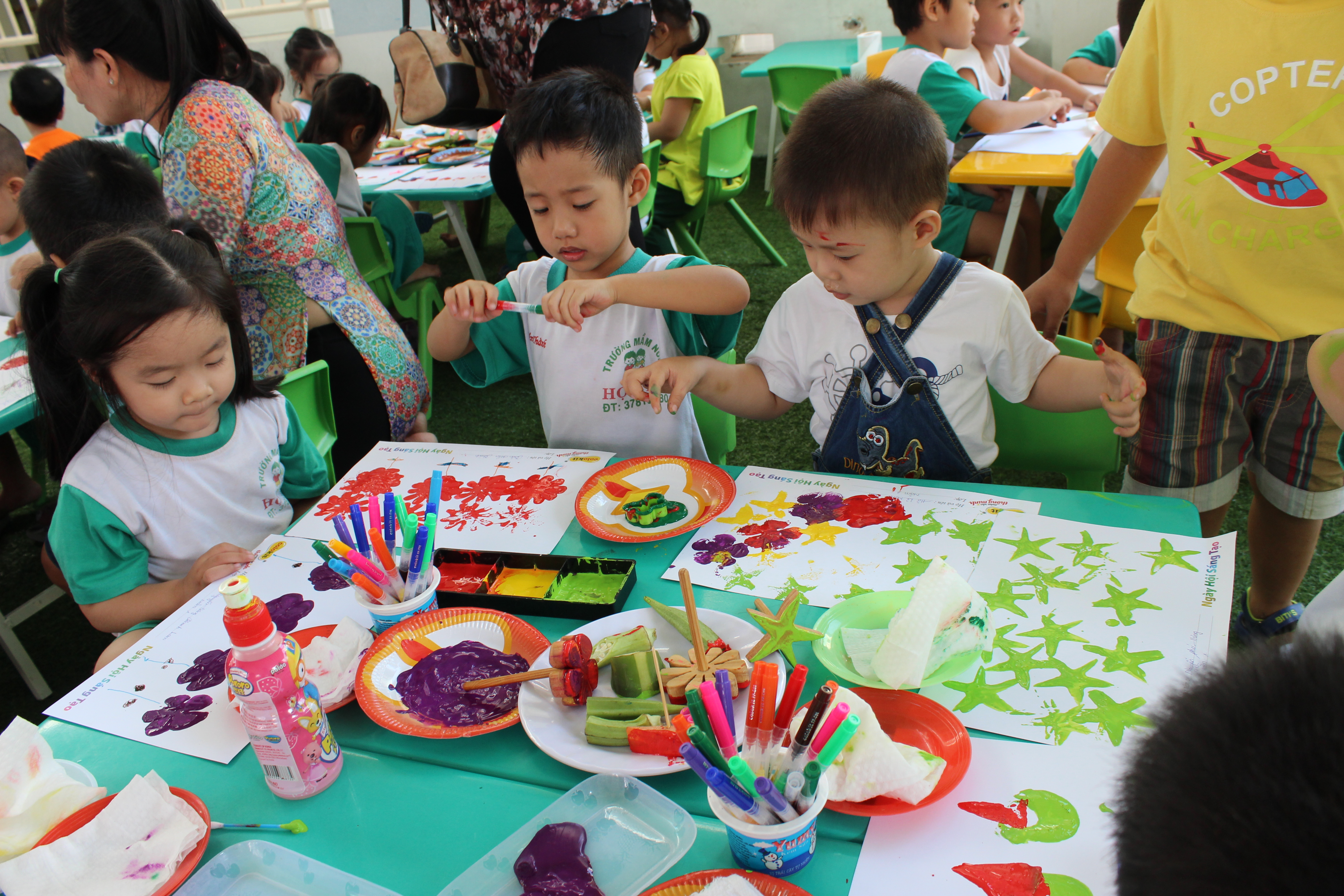 Các em học sinh lớp mầm thực hành in hình với màu nước.