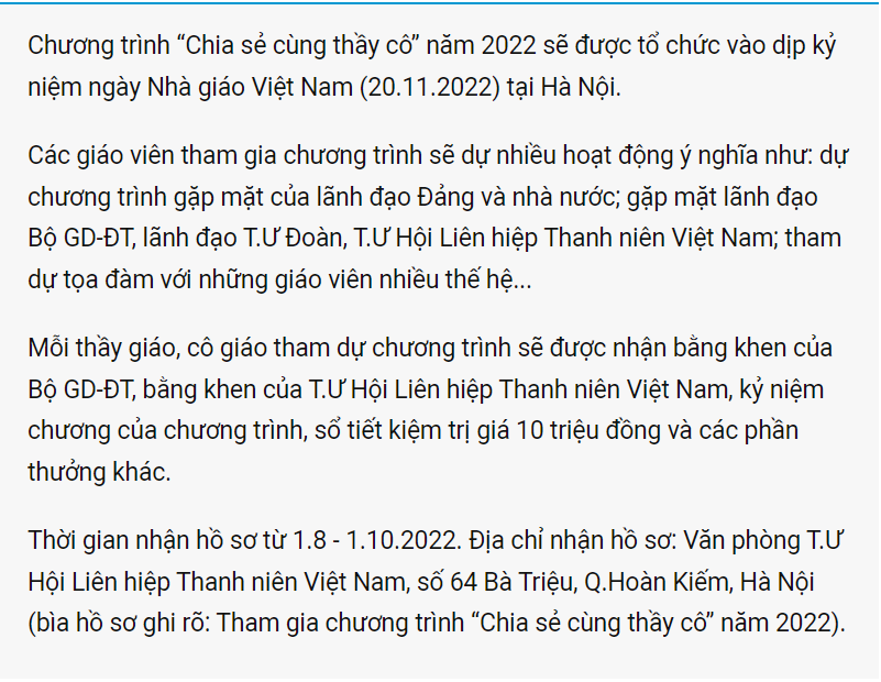 Nhằm cổ vũ, động viên các thầy giáo, cô giáo có nhiều đóng góp cho sự nghiệp giáo dục nước nhà, trong dịp 20.11 hàng năm, Đoàn TNCS Hồ Chí Minh, Hội Liên hiệp Thanh niên Việt Nam tổ chức nhiều hoạt động ý nghĩa, trong đó có chương trình “Chia sẻ cùng thầy cô”.