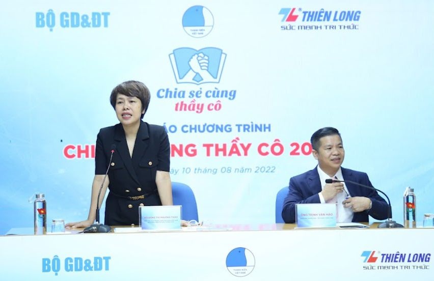 Ngày 10.8, tại Hà Nội, T.Ư Hội Liên hiệp Thanh niên Việt Nam phối hợp với Bộ GD-ĐT và Tập đoàn Thiên Long tổ chức họp báo thông tin về chương trình “Chia sẻ cùng thầy cô” năm 2022, với sự chủ trì của chị Đặng Thị Phương Thảo, Phó chủ tịch T.Ư Hội Liên hiệp Thanh niên Việt Nam, Phó tổng biên tập Báo Thanh Niên; ông Trịnh Văn Hào, Giám đốc Marketing Tập đoàn Thiên Long.