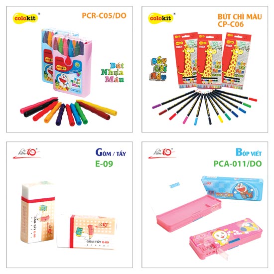 Các bậc phụ huynh có thể tham khảo bộ sản phẩm cho học sinh tiểu học vừa đạt tiêu chuẩn an toàn vừa tiện dụng của Tập đoàn Thiên Long: - Bút sáp nhựa màu PCR-C05/DO: Màu tự nhiên, dễ dàng gôm, tẩy khi bị tô sai. - Bút chì màu CP-C06: Có thiết kế phù hợp với tay của học sinh, hạn chế tình trạng gãy khi chuốt. - Gôm E-09 (Gôm trắng): Gôm/tẩy dẻo dai, ít bụi trong quá trình bôi xóa, không làm rách giấy. - Hộp bút PCA-011/DO: Thiết kế năng động gồm hai ngăn. Bên trong hộp bút có bảng cửu chương giúp các bé học bất cứ khi nào muốn.