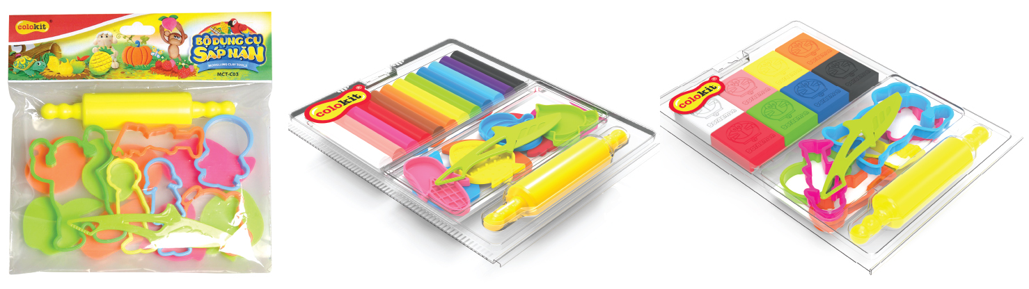 Các loại sáp nặn MCT-C01/DO, MCT-C02, MCT-C03 bao gồm: Sáp nặn, dao cắt sáp, rulo cán nặn và bộ khuôn tạo hình, giúp bé thỏa sức sáng tạo cùng với sáp nặn.