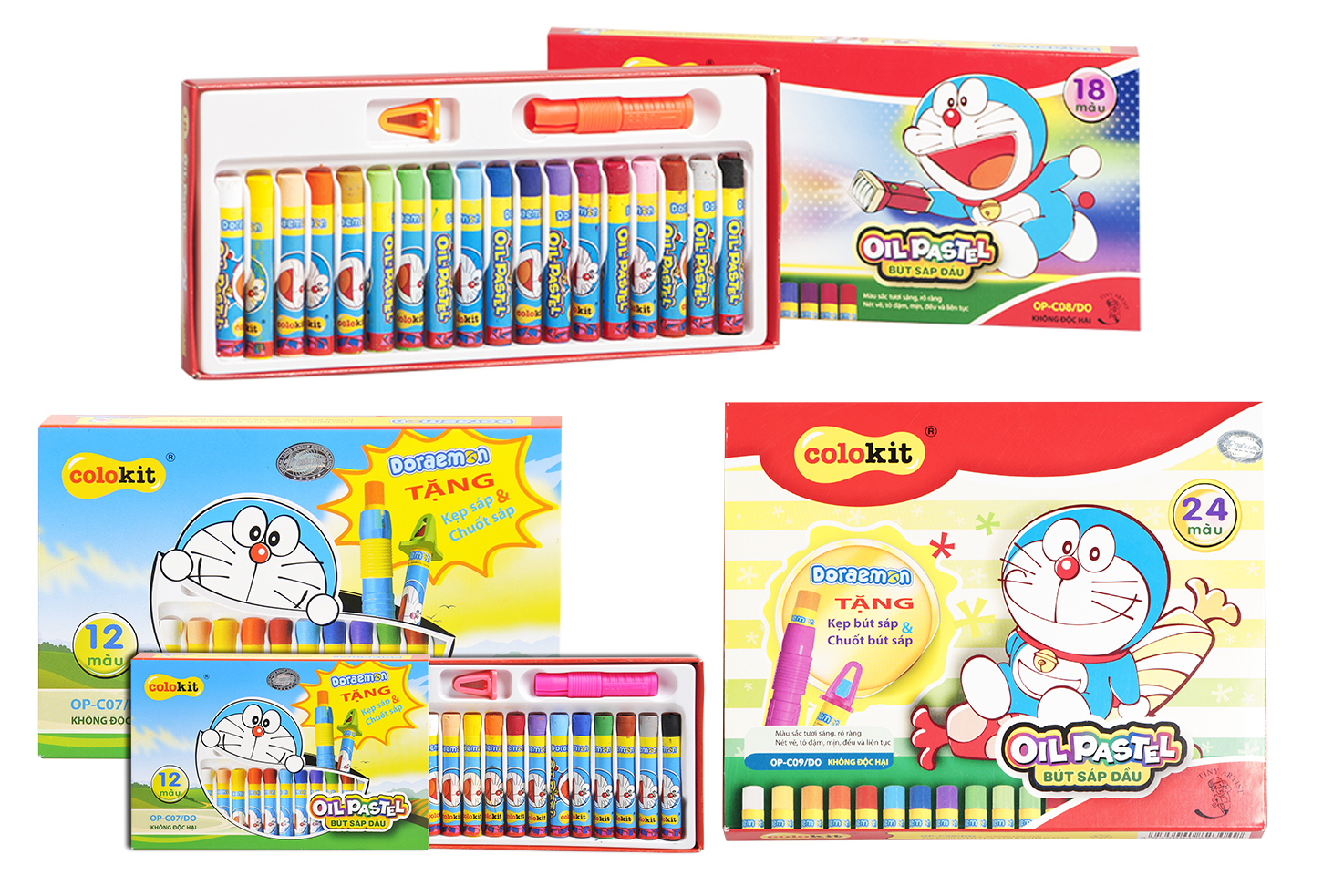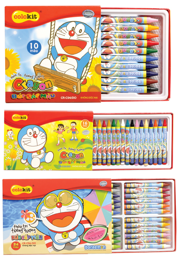 CR-C04/DO 10 màu, CR-C05/DO 16 màu, CR-C06/DO 24 màu -có lớp giấy bảo vệ in hình Doraemon ngộ nghĩnh dễ thương. Hộp có màng định hình, bảo vệ sáp tốt và dễ lưu trữ.