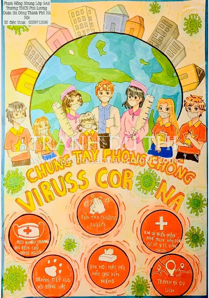 Tác phẩm: “Chung tay phòng chống Virut Corona” - Phạm Hồng Nhung, lớp 9A8 Trường THCS Phú Lương, quận Hà Đông, thành phố Hà Nội