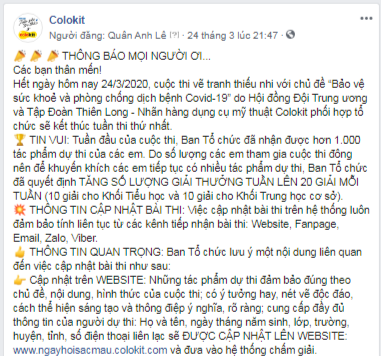 Cuộc thi vẽ tranh thiếu nhi do Hội đồng Đội Trung ương phối hợp cùng Tập đoàn Thiên Long, nhãn hàng Dụng cụ mỹ thuật Colokit tổ chức diễn ra từ 18/3 - 14/04/2020. Mỗi tuần, Ban tổ chức sẽ công bố danh sách các tác phẩm đạt giải.