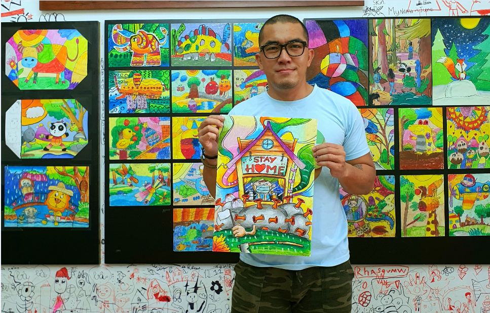 Tác phẩm: Cách chúng em phòng bệnh Covid-19 - Phan Thị Huyền Linh, lớp 5A2 Trường Tiểu học Bắc Hồng, thị xã Hồng Lĩnh, tỉnh Hà Tĩnh. Bức tranh sử dụng những tông màu nóng như đỏ, cam, vàng để thể hiện sự cấp bách của dịch bệnh, khiến những hành động đơn giản như rửa tay, dọn dẹp nhà cửa trở nên có ý nghĩa hơn khi ta thực hiện đầy đủ.
