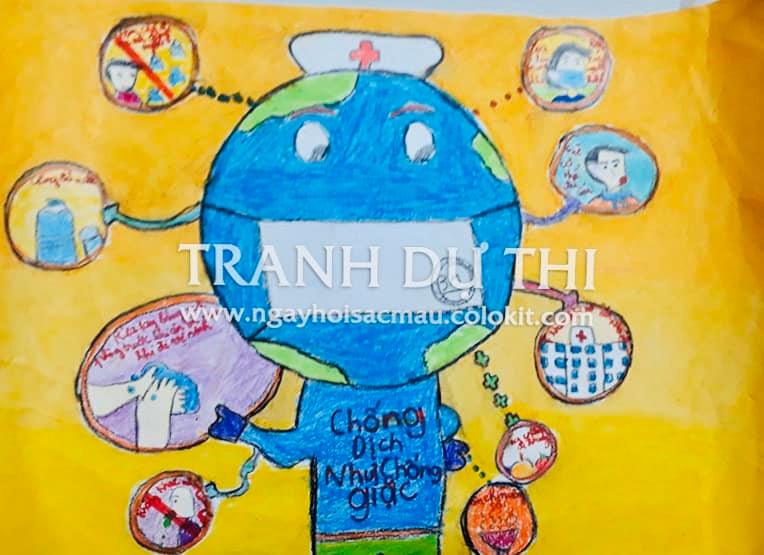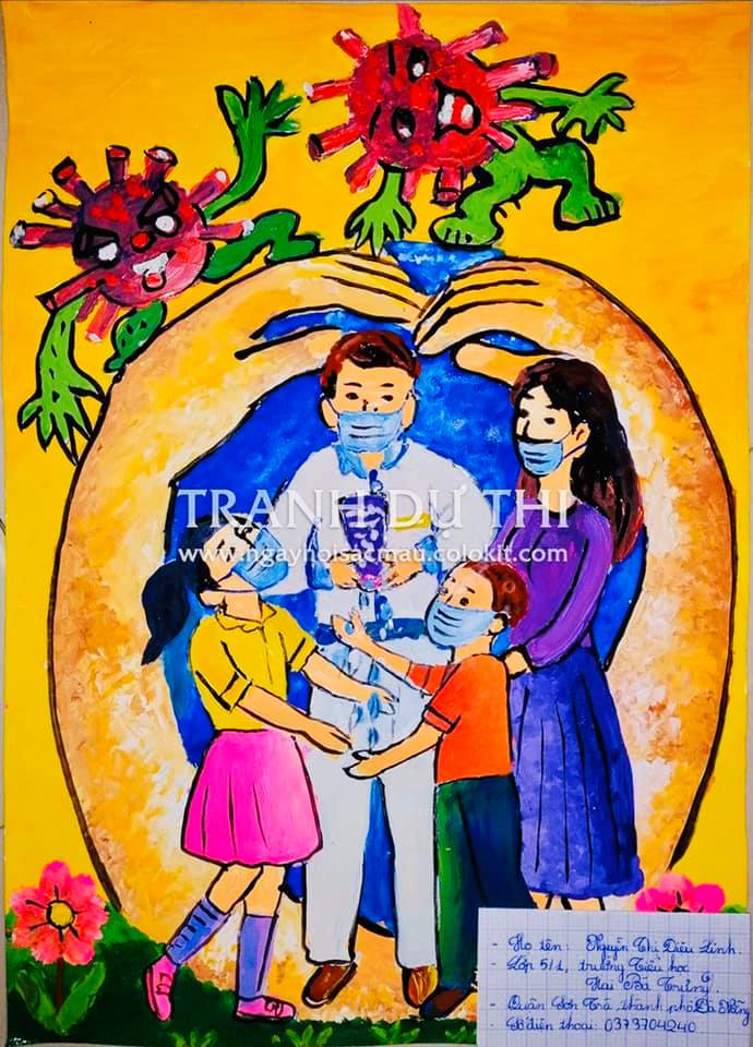 Tác phẩm: Chống dịch bệnh như chống giặc - Đào Như Bảo Minh, lớp 5A2 Trường Tiểu học Thịnh Quang, quận Đống Đa, thành phố Hà Nội. Không chỉ mô tả những hành động cần làm ngay, bức tranh còn là hồi chuông báo động về đại dịch cũng như kêu gọi người xem “chống dịch như chống giặc”, mỗi người đều cần góp sức để sớm đạt được thành công.