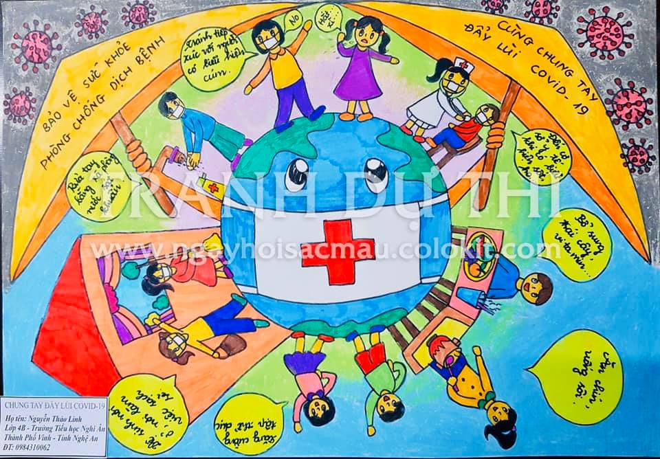 Tác phẩm: Chung tay đẩy lùi Covid-19 - Nguyễn Thảo Linh, lớp 4B Trường Tiểu học Nghi Ân, thành phố Vinh, tỉnh Nghệ An đã miêu tả rất sinh động những hành động cần làm ngay để bảo vệ bản thân khỏi dịch Covid-19.
