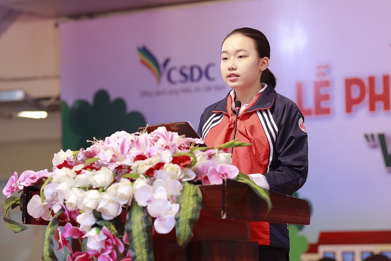 Đại diện học sinh phát biểu cảm nghĩ về chương trình “Vì mái trường xanh” trong buổi lễ phát động