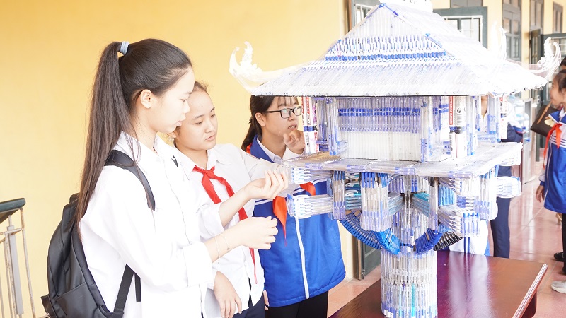 Ba mô hình: Bản đồ Việt Nam, Chùa Một Cột và đèn chùm được tái chế từ những chiếc bút bi đã qua sử dụng là dấu ấn ý nghĩa về mùa Vì Mái Trường Xanh 2019 thành công