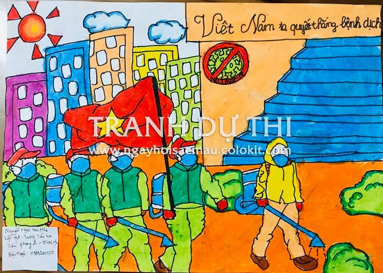 Hình 1: Tác phẩm: Việt Nam ta quyết thắng dịch bệnh của em Nguyễn Ngọc Gia Nhi, lớp 4A Trường Tiểu học Tiền Phong, huyện Mê Linh, thành phố Hà Nội là một trong những tác phẩm đạt giải ở tuần đầu tiên.