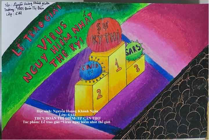 Hinh 2: Các bé có thể lựa chọn nhiều đề tài sáng tạo tương tự như tác phẩm "Lễ trao giải Virus nguy hiểm nhất thế giới" của em Nguyễn Hoàng Khánh Ngân, lớp 6A11, Trường THCS Đoàn Thị Điểm (Cần Thơ)