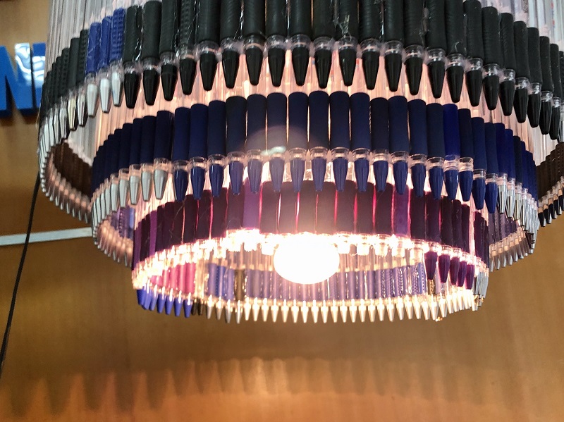 Mô hình đèn chùm sáng tạo từ các loại bút viết Thiên Long đã qua sử dụng.