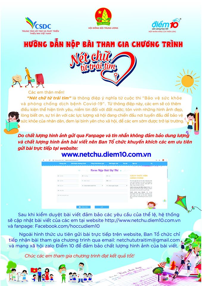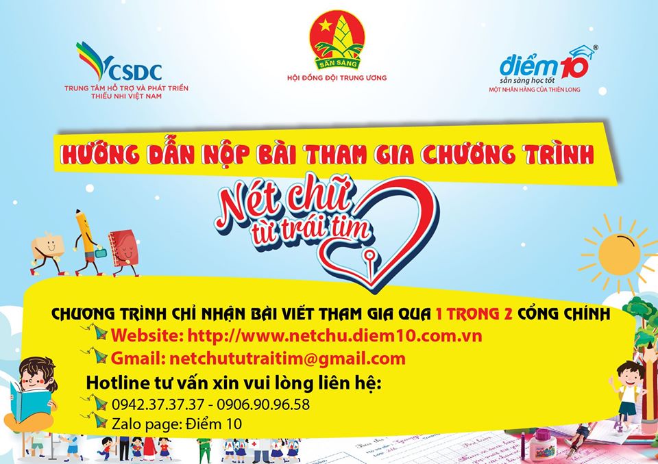 Để đảm bảo dung lượng và độ sắc nét của hình ảnh, Ban Tổ chức khuyến khích các Em gửi bài viết về 1 trong 2 cổng thông tin chính, đó là: Website http://www.netchu.diem10.com.vn và Gmail [email protected] . Nếu cần sự trợ giúp xin vui lòng liên hệ theo Hotline: 0942.373737- 0906.909658.