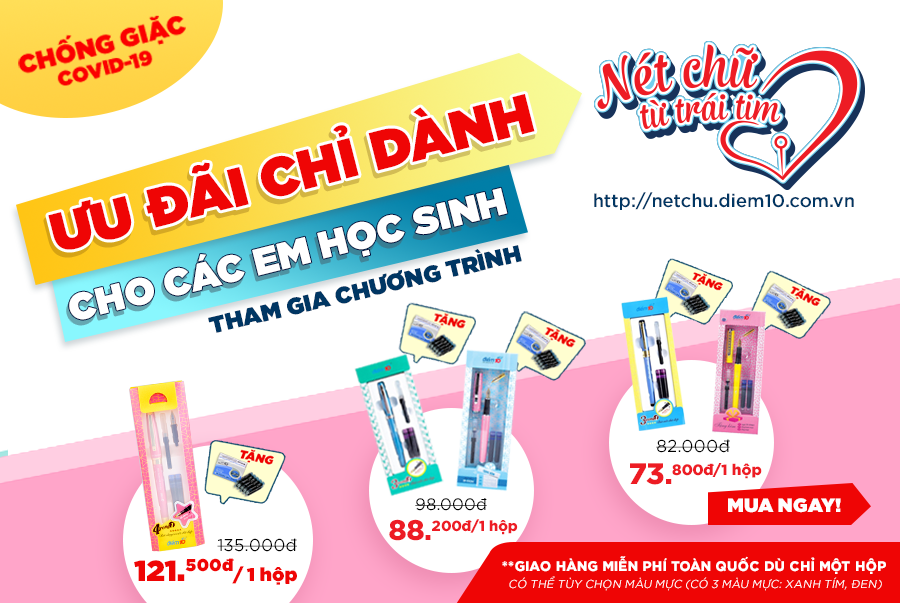 Khi mua bút máy, bút luyệt chữ Điểm 10, các em sẽ được tặng ngay hộp ống mực (10 ống). Thú vị là, các em có thể tùy ý chọn màu mực bút và màu mực tặng kèm. Chương trình áp dụng giao hàng miễn phí toàn quốc dù chỉ một hộp.