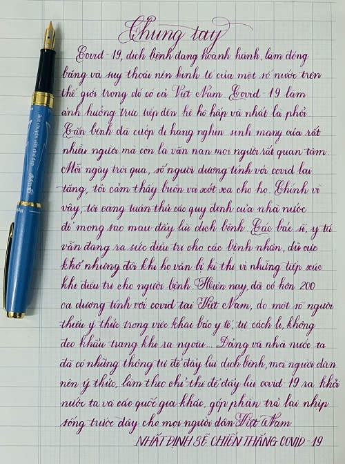 Với những nét chữ đẹp, in nghiêng, bay bổng, Thầy Lưu Hoàng Phúc dành trọn trang giấy để nêu lên cảm xúc của mình về dịch bệnh toàn cầu Covid-19. Thầy xót xa cho dịch bệnh đang cản trở sự phát triển của kinh tế Thế giới và Việt Nam; thầy thương cảm cho những thầy thuốc, bác sĩ ngày đêm hết mình vì người bệnh nhưng lại bị một số người kì thị; thầy bức xúc vì một số người thiếu ý thức trong phòng chống dịch bệnh khiến Covid-19 để lây lan rộng hơn. Và hơn cả, thầy tự nhắc bản thân và mọi người cần tuân thủ các biện pháp phòng chống dịch bệnh, để sớm đẩy lùi được virus corona ra khỏi cộng đồng sống của chúng ta. Cuối cùng là sự thể hiện một niềm tin mạnh mẽ về sự chiến thắng dịch bệnh nguy hiểm này.