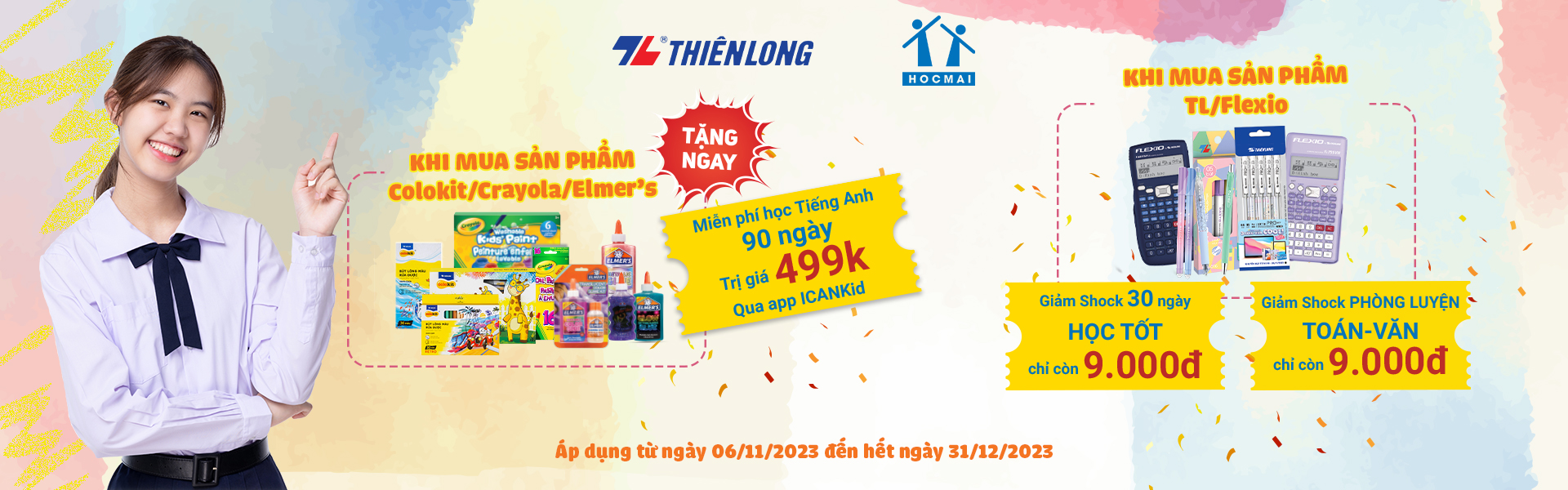 - Thể lệ: Khi mua bất kỳ sản phẩm Colokit, Crayola, Elmer’s trên Thienlong.vn khách hàng sẽ được tặng gói 3 tháng sử dụng miễn phí ICANKid - Ứng dụng giúp rèn luyện tiếng anh cho bé 2-6 tuổi trị giá 499.000đ.