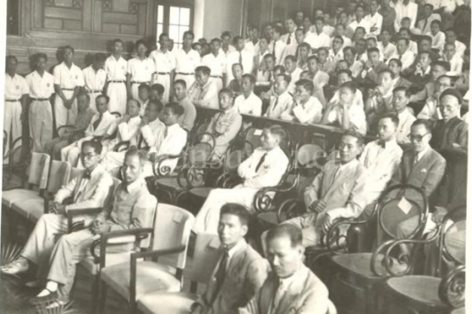 Lễ khai giảng trường Đại học Quốc gia Việt Nam, khóa đầu tiên dưới thời Chính phủ Việt Nam Dân chủ Cộng hòa vào ngày 13/11/1945. Trong ảnh, Chủ tịch Hồ Chí Minh cùng Bộ trưởng Giáo dục Vũ Đình Hòe (ngồi cạnh) dự lễ khai giảng - Ảnh tư liệu