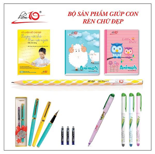 Bộ sản phẩm giúp con rèn chữ đẹp bao gồm: Bút chì gỗ GP–021, Tập vở Animal NB-061, sách “Luyện viết chữ đẹp LVCĐ-03” và bút lông kim FL-09