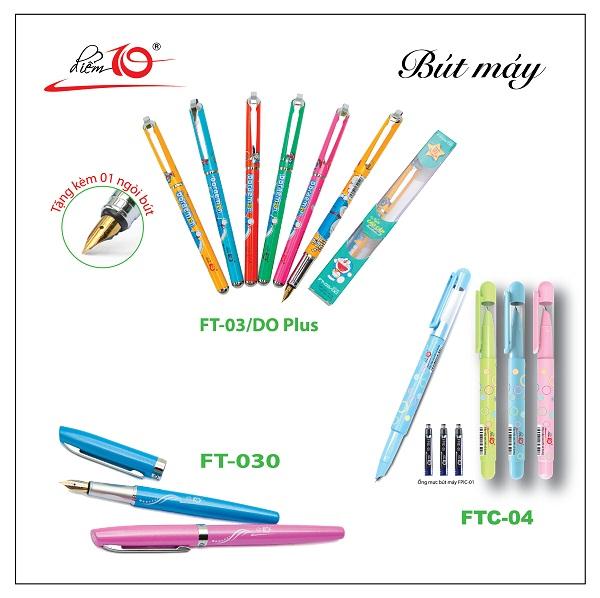 Các dòng bút máy thuộc nhãn hàng Dụng cụ Điểm 10 của Tập đoàn Thiên Long Bút máy Điểm 10 FT-030: Thân bút bằng kim loại, lớp sơn "trân châu" độc đáo theo công nghệ tiên tiến không độc hại. Ngòi mài nông FPN-05 được cải tiến mới, viết êm, trơn, không cào giấy mà vẫn viết được chữ nét thanh nét đậm. Bút luyện chữ đẹp FT03/DO Plus: Thân bút bằng kim loại nhẹ, nhỏ gọn, có trọng lượng nhẹ, dễ cầm, viết lâu không mỏi tay, rất thích hợp với học sinh tiểu học. Ngòi mài nông FPN-06 được cải tiến mới, viết êm, trơn, không cào giấy mà vẫn viết được chữ nét thanh nét đậm. Bút máy FTC-04: Bút sử dụng ngòi FPN-07 có hạt Iridium siêu bền. Viết trơn, nét nhỏ, rất thích hợp cho học sinh lớp 1 bắt đầu tập viết. |