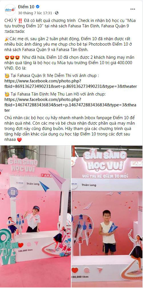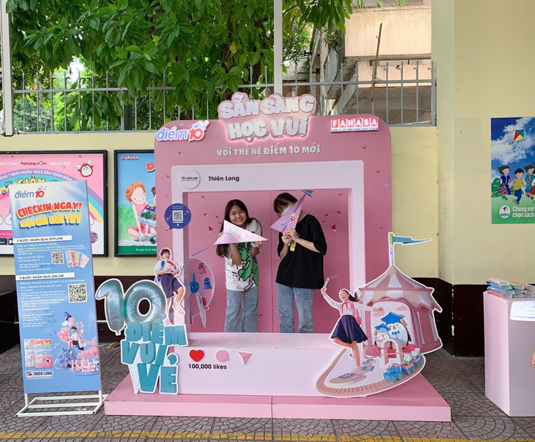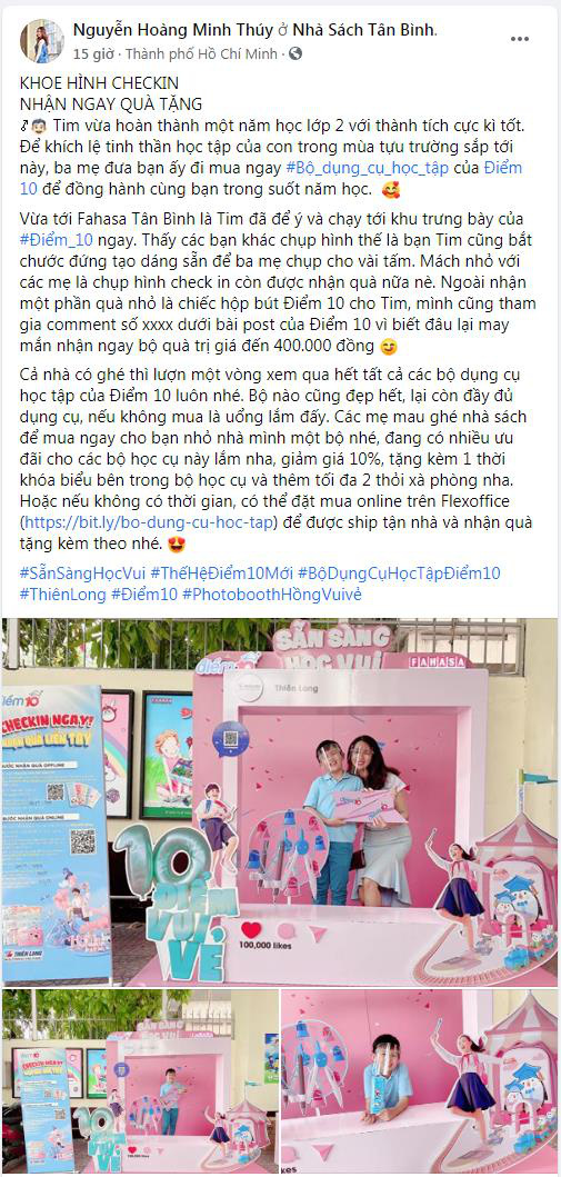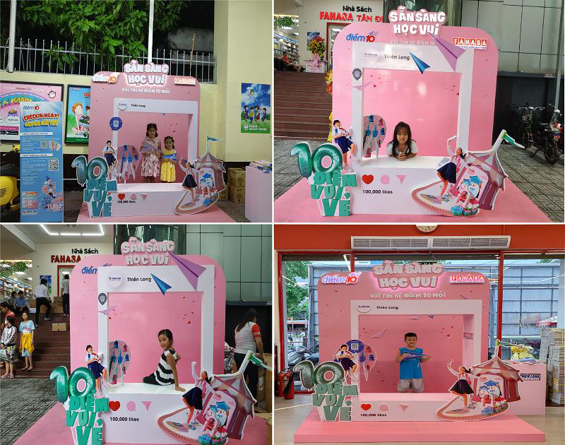 Hoạt động check-in nhận quà vẫn đang tiếp tục diễn ra vô cùng sôi nổi tại nhà sách Fahasa Tân BìnhCác bạn nhỏ ở xa đừng vội tủi thân vì không được chụp hình cùng điểm 10 nhé! Vì các em vẫn có thể sở hữu bộ dụng cụ học tập Điểm 10 bằng cách đặt mua online tại Kênh thương mại điện tử https://flexoffice.com/pages/mua-tuu-truong