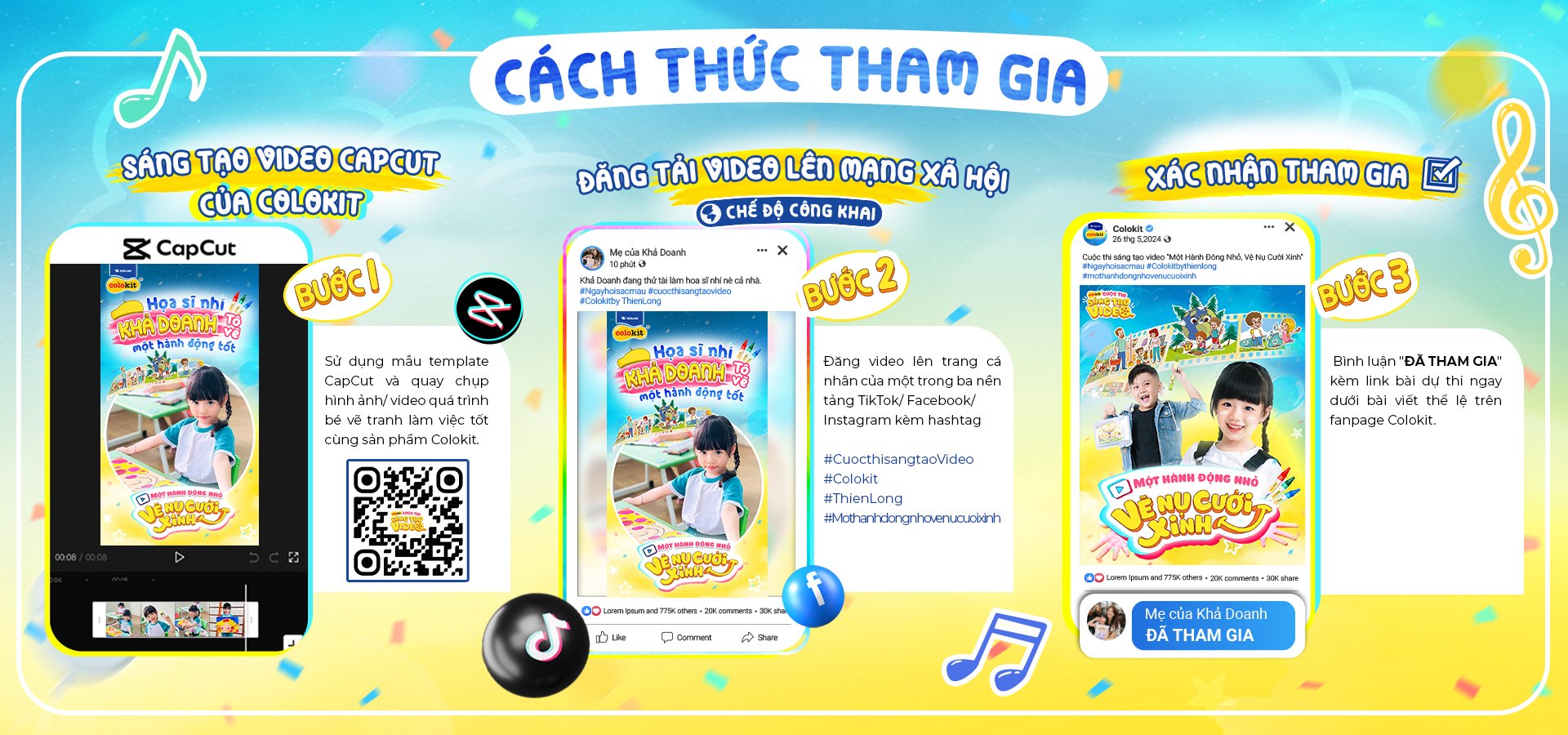 - Thí sinh hoặc Ba Mẹ/ Người giám hộ chủ động cập nhật thể lệ Chương Trình trên trang Fanpage Colokit, các thông báo từ BTC thông qua các kênh truyền thông của nhãn hàng Colokit (Facebook, Youtube, TikTok)