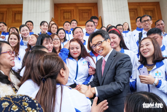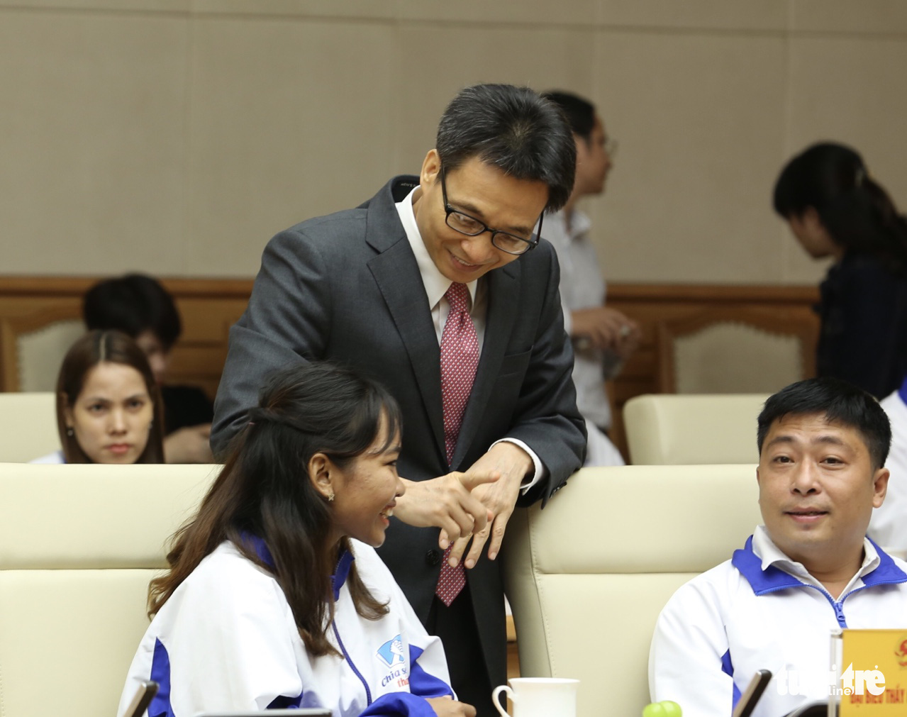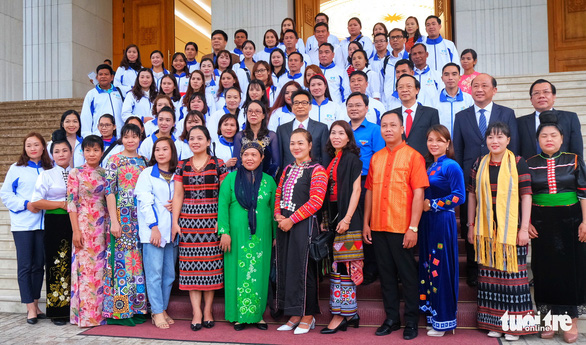 63 thầy cô giáo dân tộc thiểu số đến từ các tỉnh, thành xa xôi bày tỏ niềm vui được gặp mặt Phó thủ tướng Vũ Đức Đam - Ảnh: HÀ THANH
