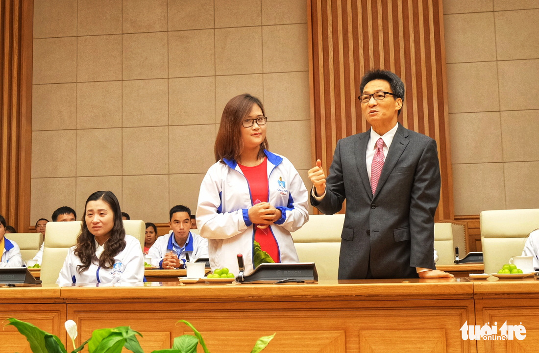 Phó thủ tướng Vũ Đức Đam chia sẻ với câu chuyện của cô giáo Hà Ánh Phượng, 29 tuổi, giáo viên tiếng Anh Trường THPT Hương Cần, tỉnh Phú Thọ lọt vào top 10 giáo viên toàn cầu do Tổ chức Varkey Foundation công bố. Cô Phượng là một trong 63 gương giáo viên được tuyên dương lần này - Ảnh: HÀ THANH