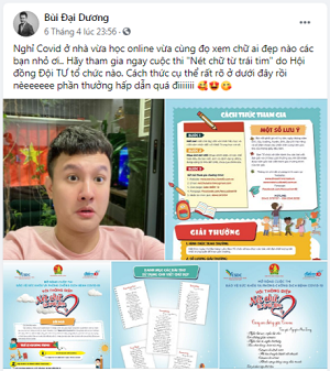 Hưởng ứng chương trình “Nét chữ từ trái tim”, MC Đại Dương vô cùng phấn khích: “Nghỉ Covid ở nhà vừa học online vừa cùng đọ xem chữ ai đẹp nào các bạn nhỏ ơi… Hãy tham gia cuộc thi “Nét chữ từ trái tim” do Hội đồng Đội Trung ương tổ chức nào. Cách thức cụ thể rất rõ ở dưới đây rồi nè. Phần thưởng hấp dẫn quá đi!!!”.