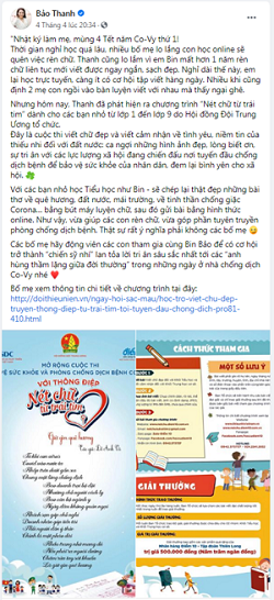 Diễn viên Bảo Thanh viết nhật ký trên Fanpage của mình: “Thời gian nghỉ học quá lâu, nhiều bố mẹ lo lắng con học online sẽ quên việc rèn chữ. Thanh cũng lo lắng lắm, vì em Bin mất hơn 1 năm rèn chữ liên tục mới viết được ngay ngắn, sạch đẹp. Nghỉ dài thế này, em lại học trực tuyến, càng ít có cơ hội tập viết hàng ngày. Nhiều khi cũng định 2 mẹ con ngồi vào bàn luyện viết với nhau mà thấy ngại ghê.