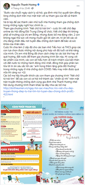 Diễn viên Thanh Hương tâm sự: “Bước vào chuỗi ngày cách ly xã hội, gia đình nhà Voi đồng lòng chống dịch trên mọi Mặt trận với sự tham gia của các thành viên. Và bí kíp để các thành viên nhỏ tuổi nhà Hương tham gia chống dịch trong những ngày nghỉ học chính là… Tham gia chương trình “Nét chữ từ trái tim” – cuộc thi viết chữ đẹp online do Hội đồng Đội Trung ương tổ chức.