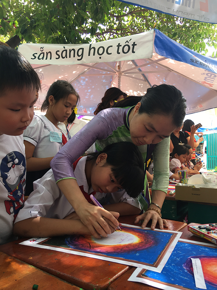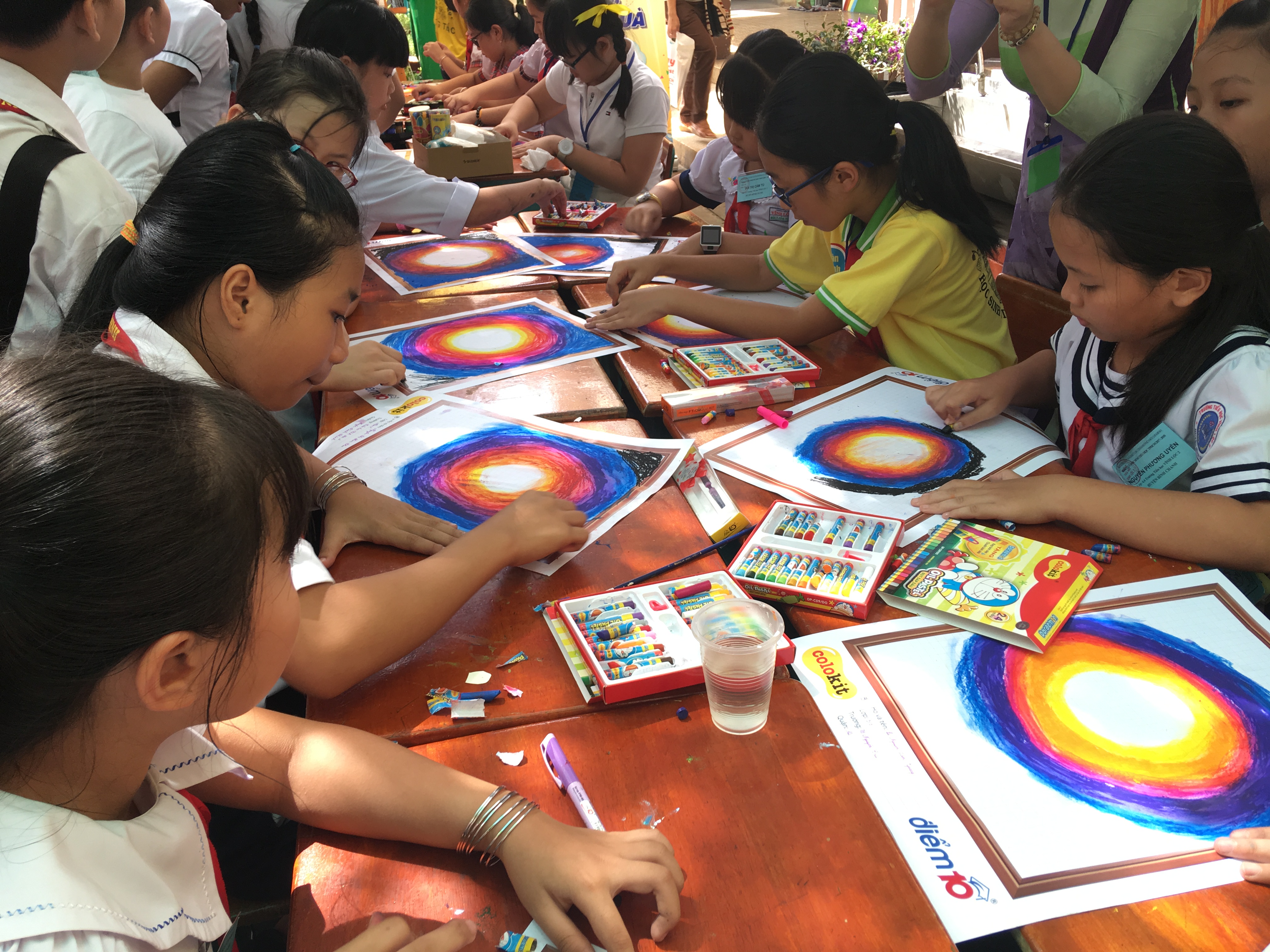 Nhiều em học sinh tỏ ra ngạc nhiên vì chỉ với một vài thủ thuật như dùng ngón tay di màu sắc, dùng bông gòn chấm màu nước…, các em đã tạo nên những bức tranh sống động về vũ trụ, bầu trời… Đồng hành cùng các em học sinh trong quá trình tạo nên những bức tranh này là các “trợ thủ” đắc lực như bút sáp dầu, màu nước, màu Poster, màu Acrylic, keo dán Handmade…thuộc nhãn hàng Dụng cụ mỹ thuật Colokit. Các bức tranh càng ý nghĩa hơn khi có thêm những dòng chữ chú thích do chính các em nắn nót từng nét viết dưới sự hỗ trợ của giáo viên hướng dẫn và Bút máy luyện viết chữ Điểm 10. Bức tranh là món quà độc đáo các em gửi tặng chính mình và người thân sau khi tham gia ngày hội.