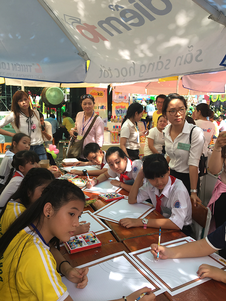 Vừa qua, tại ngày hội “Em yêu thành phố của em”, nhiều em học sinh tiểu học sẵn sàng xếp hàng trong thời gian dài để được trải nghiệm nghệ thuật 2V với các sản phẩm từ nhãn hàng Dụng cụ Mỹ thuật Colokit và nhãn hàng Dụng cụ Học tập Điểm 10 của Thiên Long.