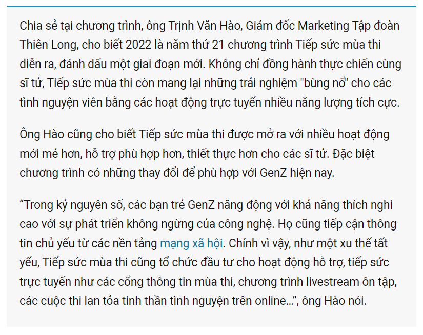 Phát biểu tại buổi họp báo, anh Nguyễn Minh Triết cho biết, nhằm hỗ trợ thí sinh và người nhà thí sinh trong kỳ thi tốt nghiệp THPT năm 2022, T.Ư Hội Sinh viên Việt Nam, Bộ GD-ĐT, Báo Thanh Niên, Tập đoàn Thiên Long phối hợp tổ chức chương trình Tiếp sức mùa thi năm 2022.