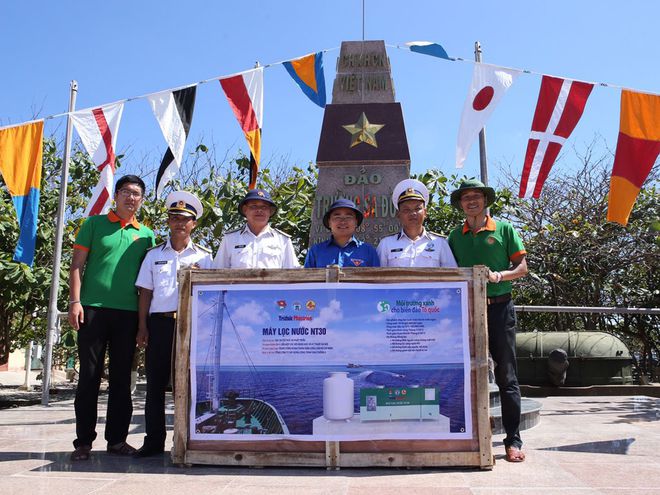 Kỹ sư Trần Vũ Thành (bìa phải) và Ủy viên T.Ư Đảng, Bí thư thứ nhất T.Ư Đoàn Nguyễn Anh Tuấn (thứ 3 từ phải qua) trao tặng máy lọc nước biển thành nước ngọt đầu tiên cho đảo Trường Sa Đông