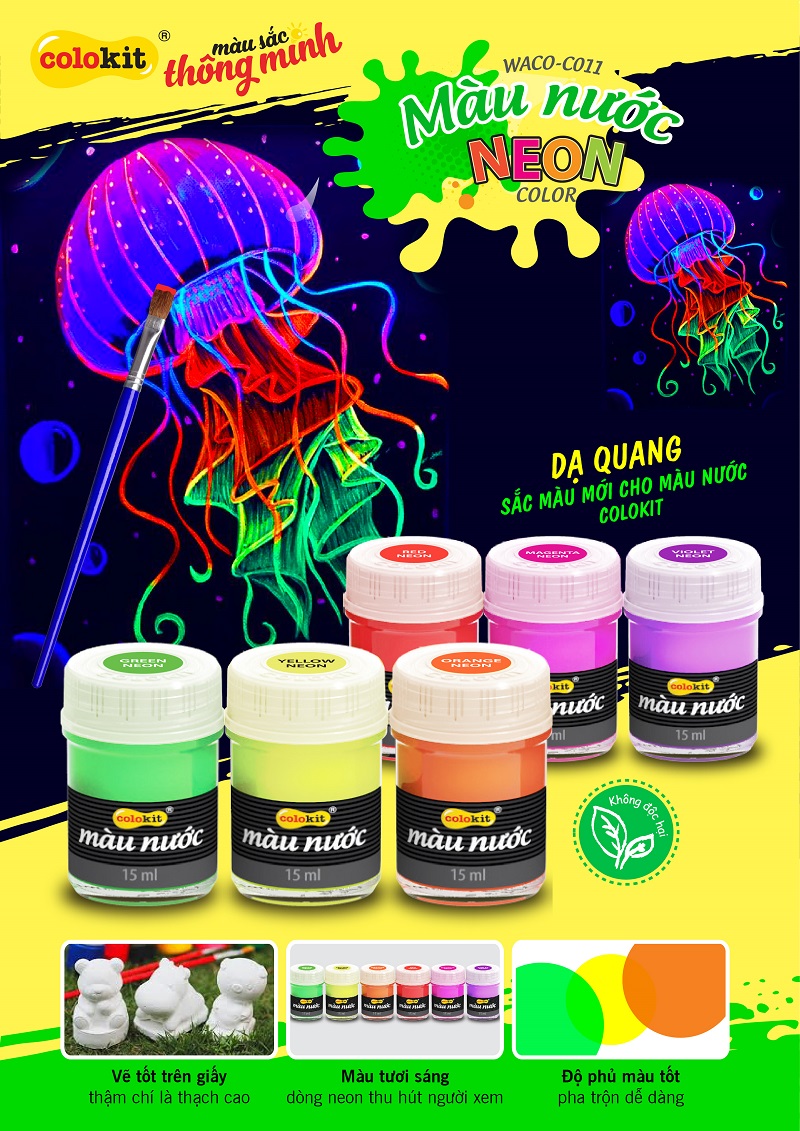 Theo đó, nhãn hàng Colokit đã giới thiệu ra thị trường nhiều sản phẩm như màu nước Neon WACO-C011 với 6 màu dạ quang cho các bé có thêm nhiều lựa chọn màu sắc. Bên cạnh đó, sản phẩm mới màu Acrylic ACR-C03 ra đời với chất lượng và quy cách đóng gói tiện lợi hơn.