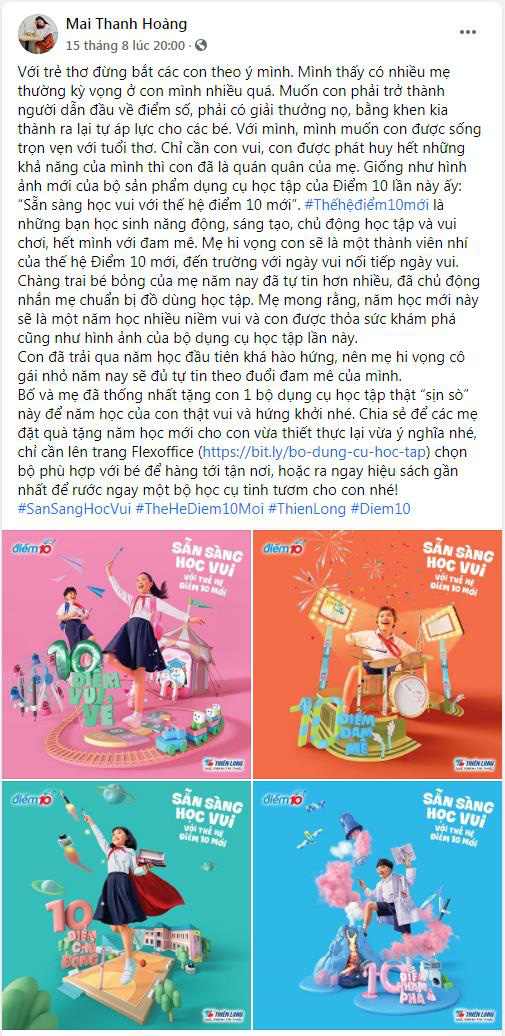 Mẹ có nick Facebook Mai Thanh Hoàng chia sẻ bộ ảnh mới của Điểm 10 trên mạng xã hội với niềm hy vọng mong bé Jun được tận hưởng trọn vẹn niềm vui khi khám những chân trời tri thức mới: "#Thếhệđiểm10mới là những bạn học sinh năng động, sáng tạo, chủ động học tập và vui chơi, hết mình với đam mê. Mẹ hi vọng con sẽ là một thành viên nhí của thế hệ Điểm 10 mới, đến trường với ngày vui nối tiếp ngày vui. Chàng trai bé bỏng của mẹ năm nay đã tự tin hơn nhiều, đã chủ động nhắn mẹ chuẩn bị đồ dùng học tập. Mẹ mong rằng, năm học mới này sẽ là một năm học nhiều niềm vui và con được thỏa sức khám phá".
