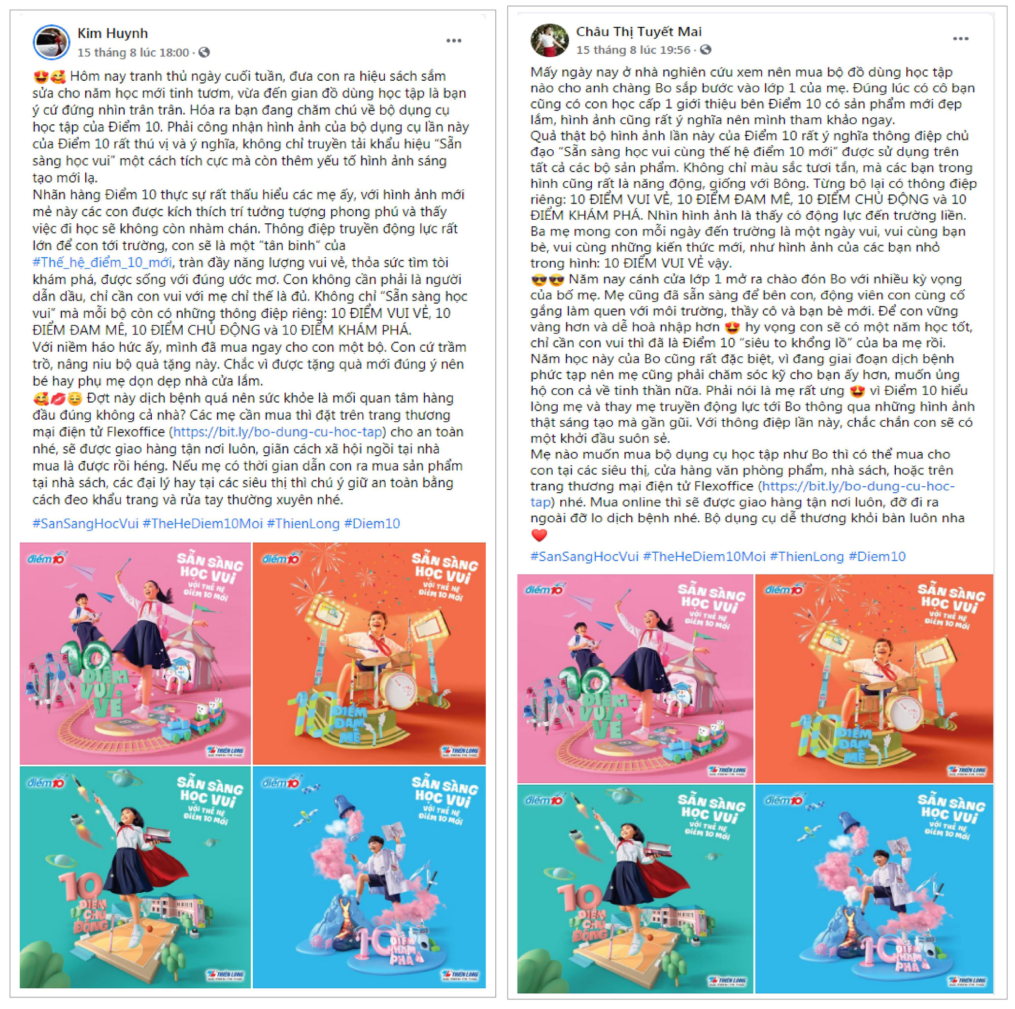 Còn mẹ Kim Huynh (nick facebook Kim Huynh) cũng gửi lời cảm ơn đến Điểm 10 qua đó thể hiện tình yêu thương vô bờ bến với cậu con trai bé bỏng: "Nhãn hàng Điểm 10 thực sự rất thấu hiểu các mẹ ấy, với hình ảnh mới mẻ này các con được kích thích trí tưởng tượng phong phú và thấy việc đi học sẽ không còn nhàm chán. Thông điệp truyền động lực rất lớn để con tới trường, con sẽ là một "tân binh" của #Thế_hệ_điểm_10_mới, tràn đầy năng lượng vui vẻ, thỏa sức tìm tòi khám phá, được sống với đúng ước mơ. Con không cần phải là người dẫn đầu, chỉ cần con vui với mẹ chỉ thế là đủ".