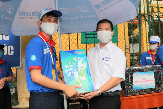 Đoàn đi thăm sinh viên tình nguyện có anh Lê Xuân Dũng, Giám đốc trung tâm Hỗ trợ học sinh, sinh viên TP.HCM, đồng thời là Trưởng ban tổ chức chương trình Tiếp sức mùa thi tại TP.HCM và ông Trịnh Văn Hào, Giám đốc marketing Tập đoàn Thiên Long, thành viên Ban tổ chức Tiếp sức mùa thi năm 2020.