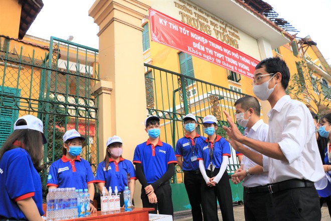 Anh Lê Xuân Dũng (bìa phải), Giám đốc trung tâm Hỗ trợ học sinh, sinh viên TP.HCM và ông Trịnh Văn Hào, Giám đốc marketing Tập đoàn Thiên Long, thành viên Ban tổ chức Tiếp sức mùa thi năm 2020 đến thăm sinh viên tình nguyện tại điểm trực ở Trường THPT Trưng Vương (Q.1)
