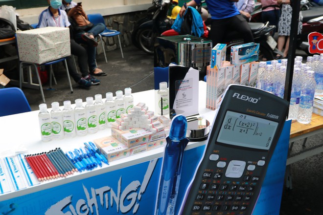 Bàn hỗ trợ các vật phẩm miễn phí và dung dịch sát khuẩn phòng dịch cho thí sinh đặt trước cổng trường thi THPT Lê Quý Đôn, Q.3.