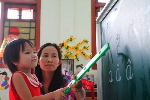 Cô và trò trường mầm non Hoa Phong Ba, huyện đảo Cồn Cỏ, Quảng Trị.